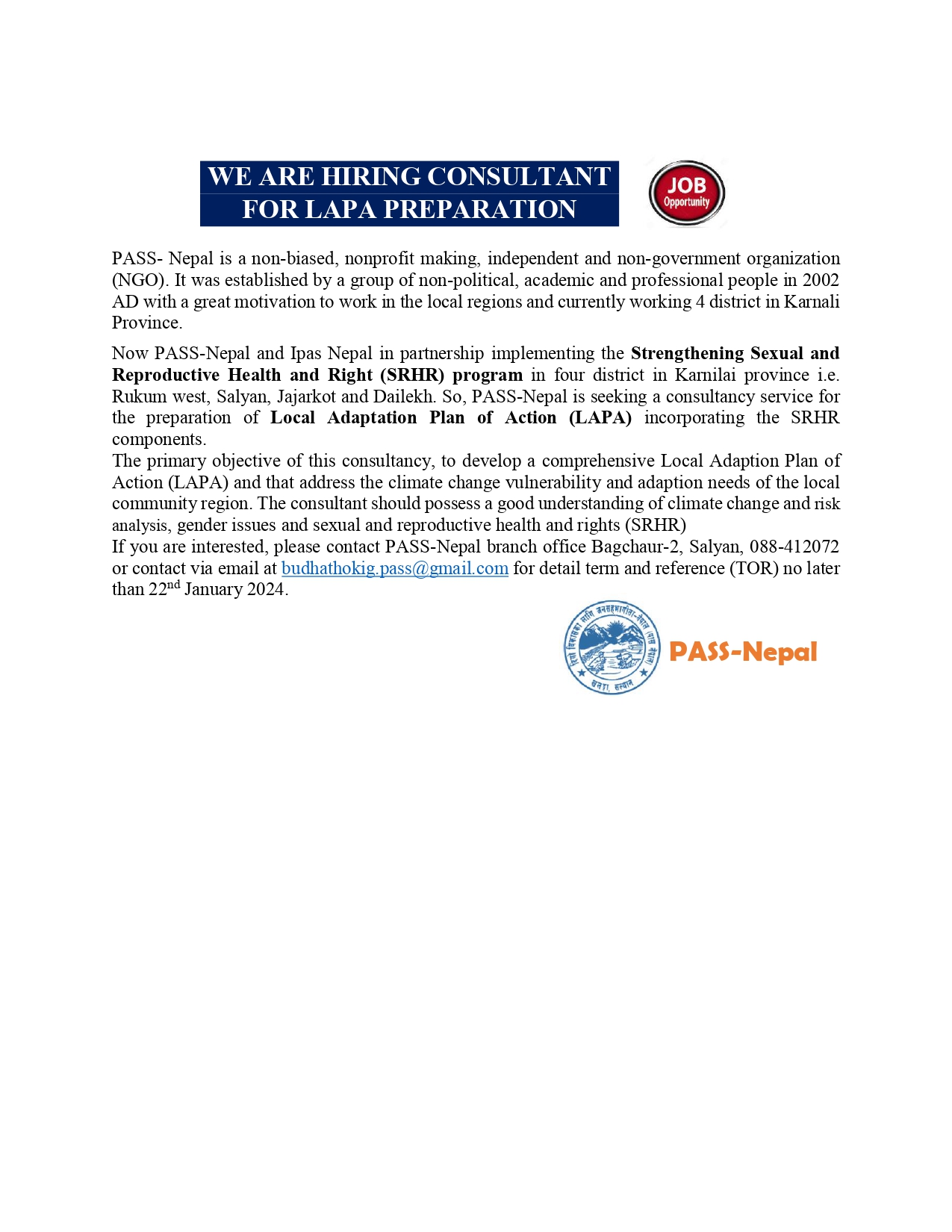Notice CategoriesVacancyJanuary 17, 2024January 17, 2024 By pass-nepal 0 Post navigationPREV map NEXT जलवायु परिवर्तन, लैंङ्गिकता, यौन तथा प्रजनन स्वास्थ्य र अधिकार सम्बन्धि ३ दिने तालिम बागचाैरमा सुरु Leave a Reply Cancel replyYour email address will not be published. Required fields are marked * Save my name, email, and website in this browser for the next time I comment.